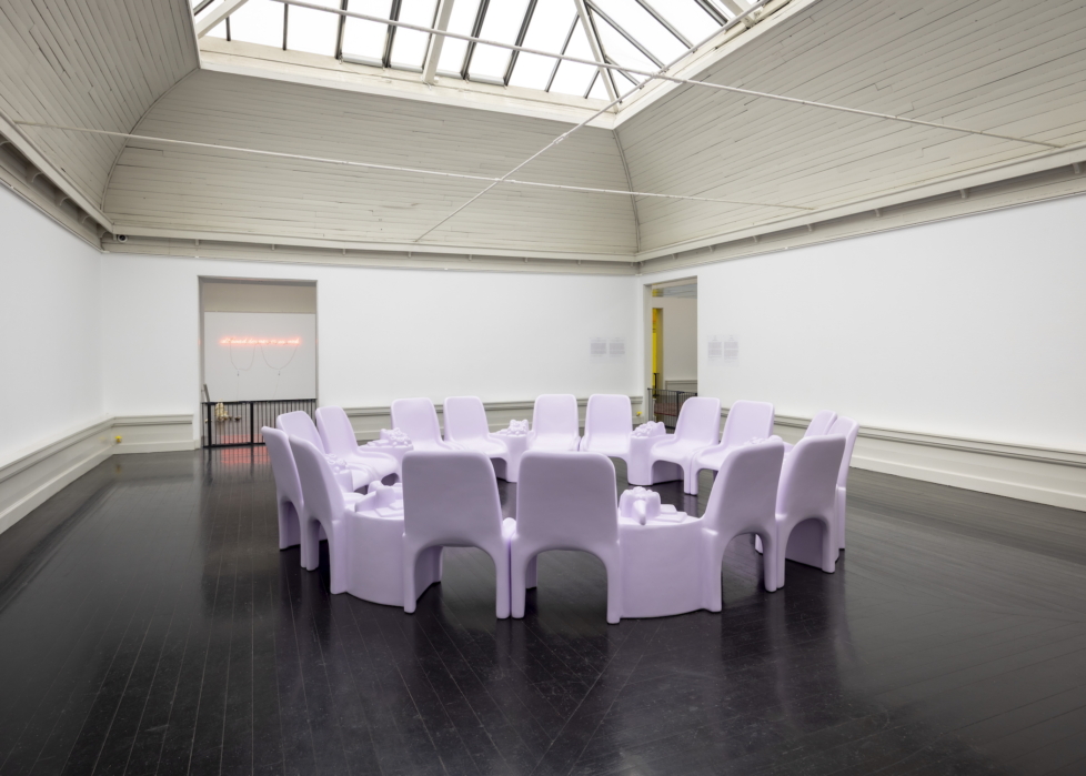 Det er også underligt opløftende at stå og bakse med børnelåsen på de børnesikkerhedsgitre, der er installeret i passagerne imellem de forskellige udstillingsrum. Det er muligt at skræve over, men håndteringen af åbne-lukkemekanismen bliver ligesom et bevis på, at man er voksen nok til at håndtere verden udenfor. Håndtere følelserne? Udvikling af evnen til at følelsesregulere begynder allerede i barnets første år, så det giver mening, at flere af kunstnerne «går i barndom». Udover gitrene med den indlejrede dobbelthed, at de både kan beskytte og ekskludere, har Ghislaine Leung for eksempel også fået installeret natlamper i form af små gule svampe i alle stikkontakter, som sammen med Steve Bishops ekstremt forstørrede dukkehusmøbler i lyslilla glasfiber placerer følelseslivet i et barnligt univers.