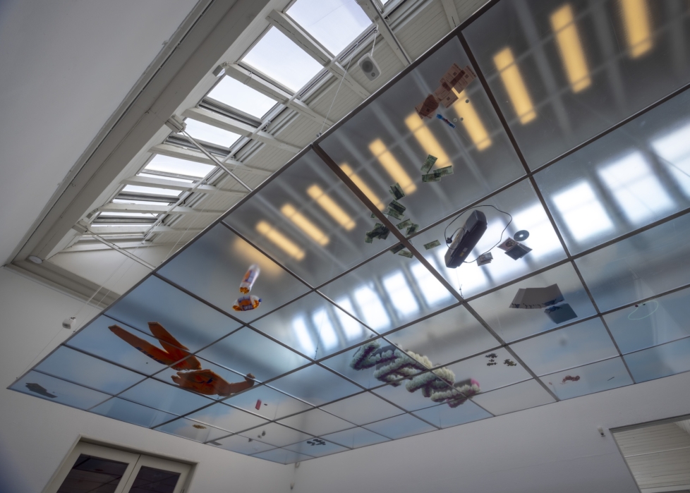 Inde i den forstørrede «Kleenex-æske», de besøgende kan gå ind i, giver Henriette Heises video- og lydværk Tissue Technology (2025) mig en følelse af at være lillebitte og skærmet for verden udenfor med al dets snot og tårer, der over alt på kloden tørres bort med de klassiske papirlommetørklæder. I videoen oplever vi nemlig kun æsken indefra, hvor lommetørklæderne, filmet i ultranær, med repetitive bevægelser én for én forlader det trygge rum. I kombination med ASMR-lydsiden virker det akut beroligende.