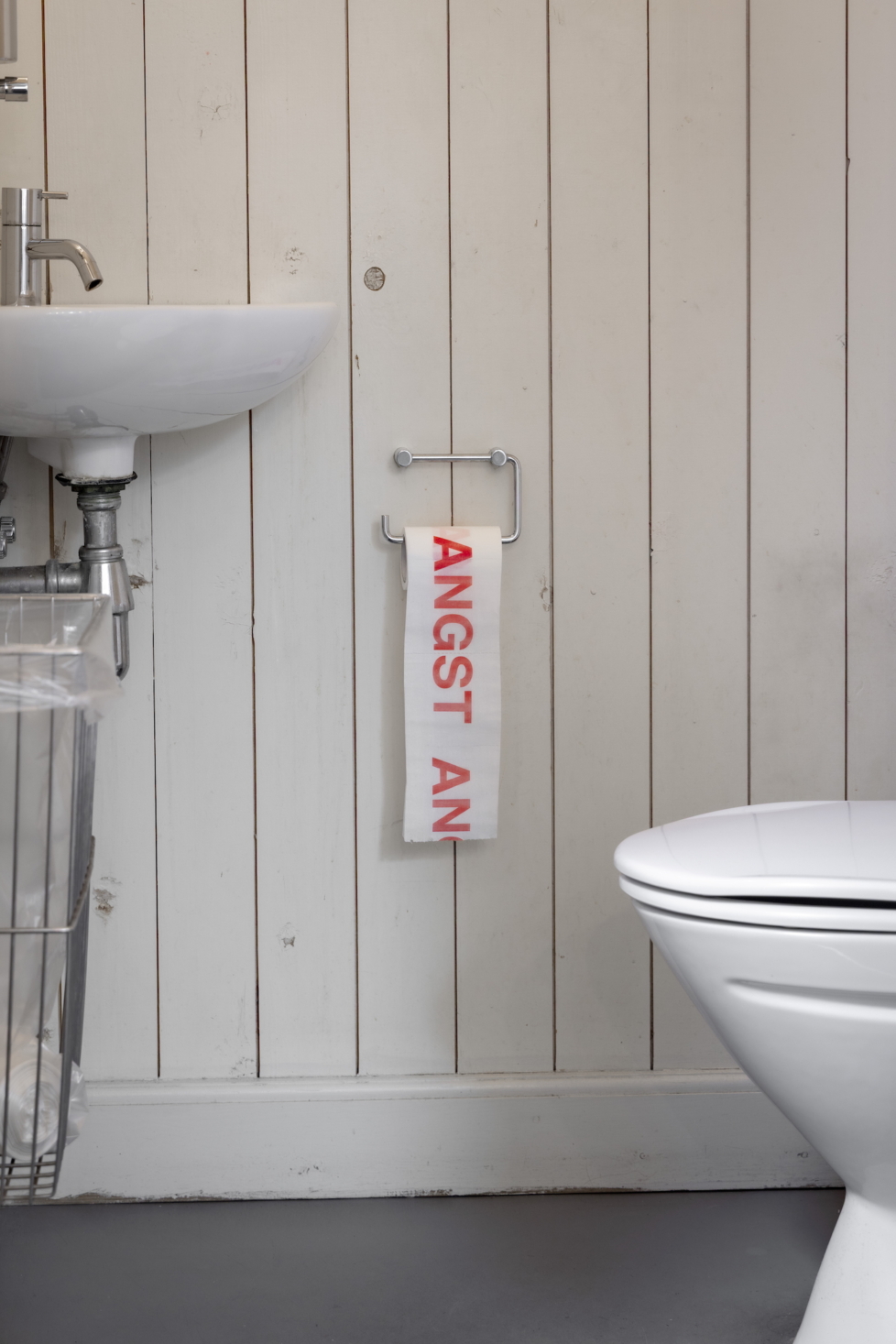 Af naturlige, ikke følelsesmæssige, årsager styrer jeg som det første direkte mod Den Fries toilet og bliver overrasket over her at finde et af udstillingens centrale værker: toiletruller med «ANGST» påtrykt i rødt. Det er helt enkelt, nærmest banalt, og derfor så konceptuelt skarpt, at det sætter et mylder af tanker i gang om den lidelse, der blomstrer i vores tid, men også er en eksistentiel grundfølelse, der forbindes med moderniteten, og er rigt skildret af Munch eller eksempelvis Storm P. i maleriet Angst eller syfilis allerede i 1906. Storm P. rummede både lyset og mørket, ligesom humoren heldigvis ligger under alvoren i Henrik Plenge Jakobsens ruller, der ikke er til at komme udenom: jeg er nødt til at tage et stykke af angsten, folde den let sammen, tørre mig og skylle den ud i toilettet – befriende.