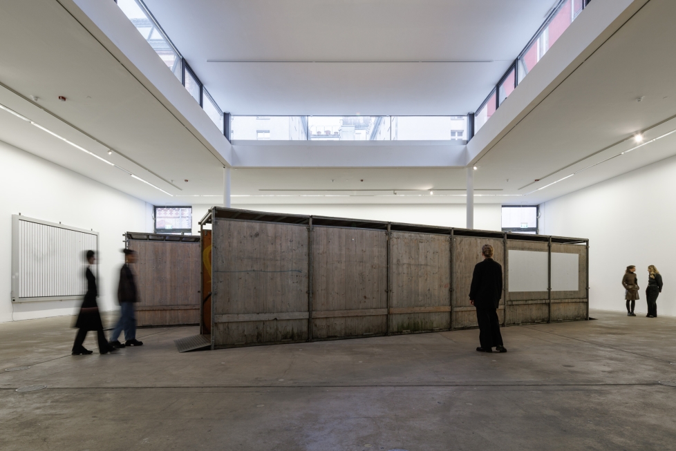I kunsthallens store sal i kælderen står skulpturen Rosie Rosie (2026) – reelt to gennemgangskorridorer af træ og stål af den slags, som beskytter fodgængere under bygningsrenovering. Set oppe fra trappen ned til salen er førstehåndsindtrykket minimalistisk skulptur med perfekte proportioner. De modulære korridorer er lavet til menneskekroppe, så den del af skulpturlogikken er på plads. Tættere på ser man, at passagerne er brugt mange gange, pladerne er taggede og skrammede.