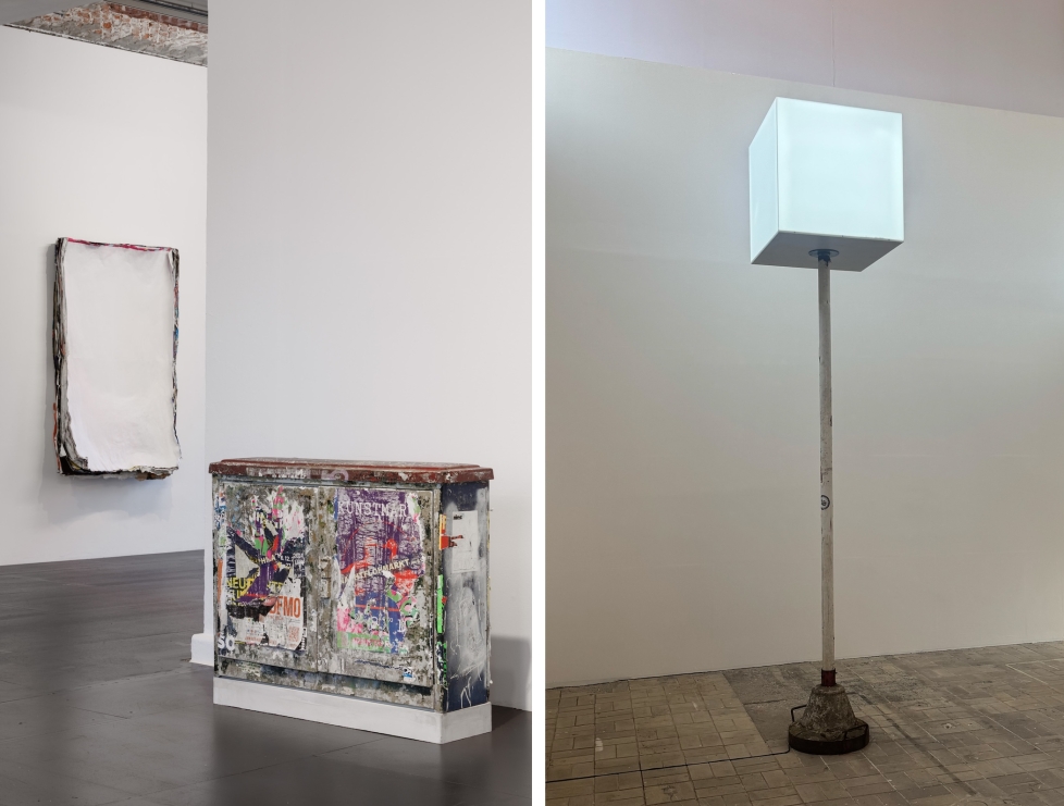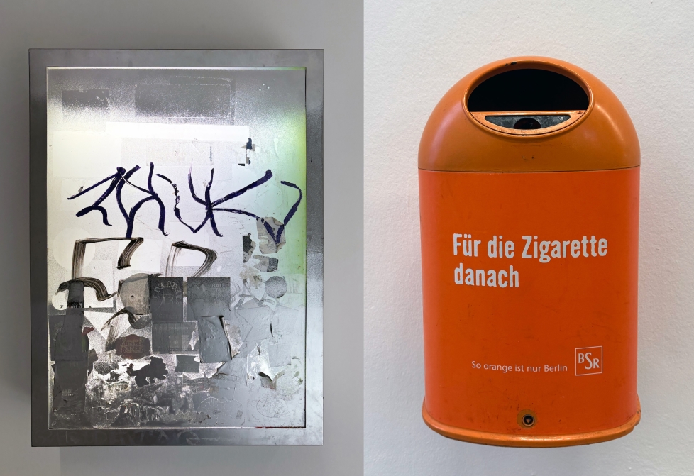 Til gengæld er KW stadig en lidt skramlet institution, der tillader at pudset fra de rå murstensvægge drysser på gulvet på en måde, som ville være utænkelig på en renskuret skandinavisk kunsthal, og som forekommer vigtig for netop denne udstilling. Byen siver ind af disse sprækker. I KWs omgivelser bliver det urbane rum, som er Lidéns materiale, effektivt slået an. Det indrammer det urbane inventar, som Lidén har hevet ind i institutionen: den bulede skraldespand fra Hamborg med kæk kommunal klistermærkepoesi, «Hier Deine Sorgen einwerfen» (Untitled (Trashcan), 2024); det tomme busstoppeskilt, strippet for al info om ruter og retning (Untitled, (Haltestelle), 2024); eller de fem elskabe opstillet på rad og række, som trods tags og klistermærker (og individuelle værktitler) fortæller om myndighedernes fælles fodslag omkring nuancer af lysegrå, hvad angår farven på infrastruktur.