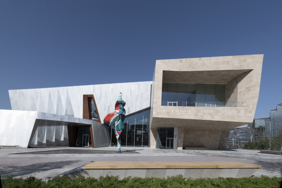 På väg in i museet kan besökarna beundra några praktexempel på utomhuskonst av det oförargligare slaget, skapade av Alicja Kwade, Jaume Plensa och Yinka Shonibare. Väl inne i mittskeppet kommer de att slås av de olika väggbeklädnaderna som signalerar olika tidsperspektiv för de tillfälliga utställningarna (borstad aluminium till vänster) och de permanenta «konstnärsrummen» med verk av Richard Serra, Anselm Kiefer, Bill Viola och Yayoi Kusama och den halvpermanenta visningen av grundarens centralasiatiska samling (polerad kalksten till höger). Båda dessa material, som även återkommer på utomhusfasaderna, ställs mot rikliga detaljer i roststål.