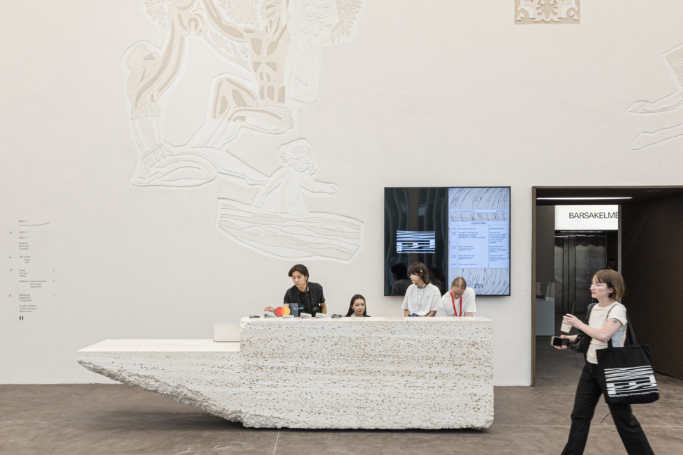 Före The Beginning, redan 2017, kom faktiskt en annan början när den brittiska arkitekten Asif Khan inbjöds att omgestalta Tselinnyj. Projektet har varit ett samarbete mellan honom och hans fru, den kazakiska arkitekten Zaure Aitajeva, och arkitektkontoret NAAW i Almaty. De har skapat en luftig sekvens av foajéer, halvt åtskilda från den något upphöjda öppna platsen utanför av en böljande fasad med lameller i vitmålat stål och ledande till en mångfunktionell «grå låda» med högt i tak som tidigare rymt 1 536 biografstolar i gradäng. I teorin är sådana utrymmen oändligt anpassningsbara. I praktiken krävs betydande ansträngningar och summor för att iordningställa dem inför exempelvis utställningar med vägghängda konstverk. I sina visualiseringar och sina offentliga framträdanden framstår Khan som förespråkare för arkitekturen som storslagen metafor eller högstämd bild. Mitt allmänna intryck av denna byggnad var en kritaktig och samtidigt krämig vithet med ett löfte hängande i luften.