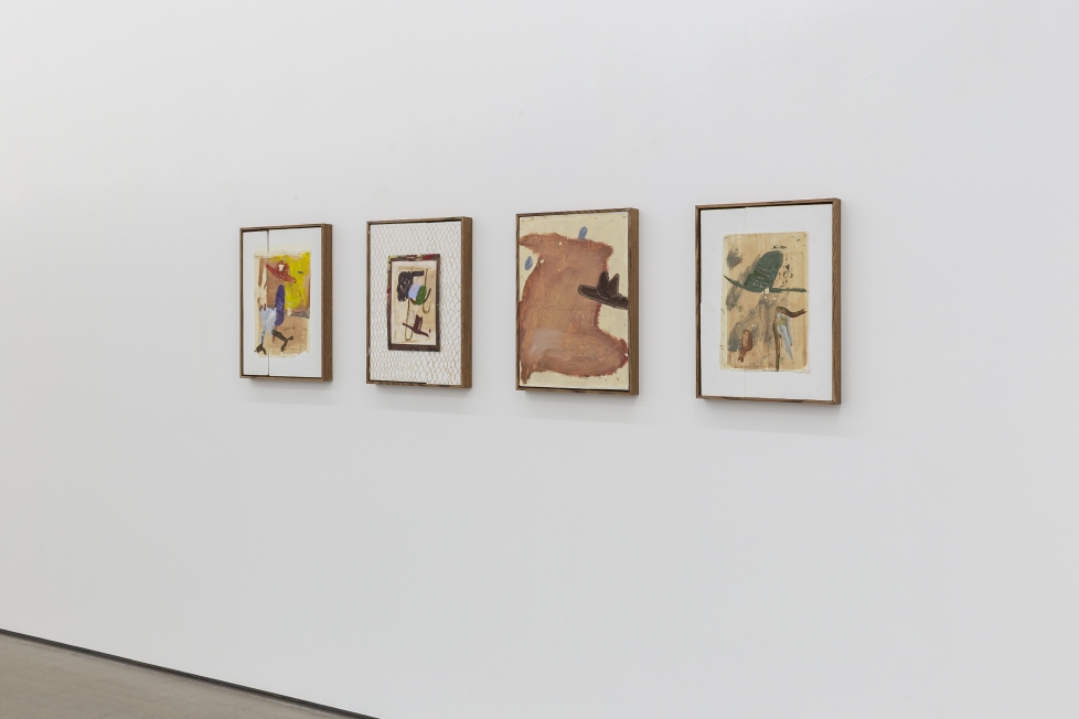 Markus Myhre har en mer slentrende og fragmentarisk tilnærming i sine olje- og bivoksarbeider på papir. Det er som han skyter fra hofta, men innenfor et ordnet opplegg. Fire av dem deler format og tittel (Under arbeid 1-4), de tre andre er noe større og med individuelle titler. De har hyppige innslag av noe som ser ut som cowboyhatter, rekvisitter innen et utvalg uformelige fargeklatter med en bardus energi som er lett å like. I flere av disse tilforlatelige komposisjonene fungerer bearbeidede plater i gips og tre som en passepartout, med ulike mønstre risset inn som bakgrunn. Helheten er vindskjev, med visuelt overskudd og øye for tilfeldighetenes spill. Det første verket på den firedelte rekken har en plate som er splittet midt i – det spriker seismologisk under den sittende figuren.