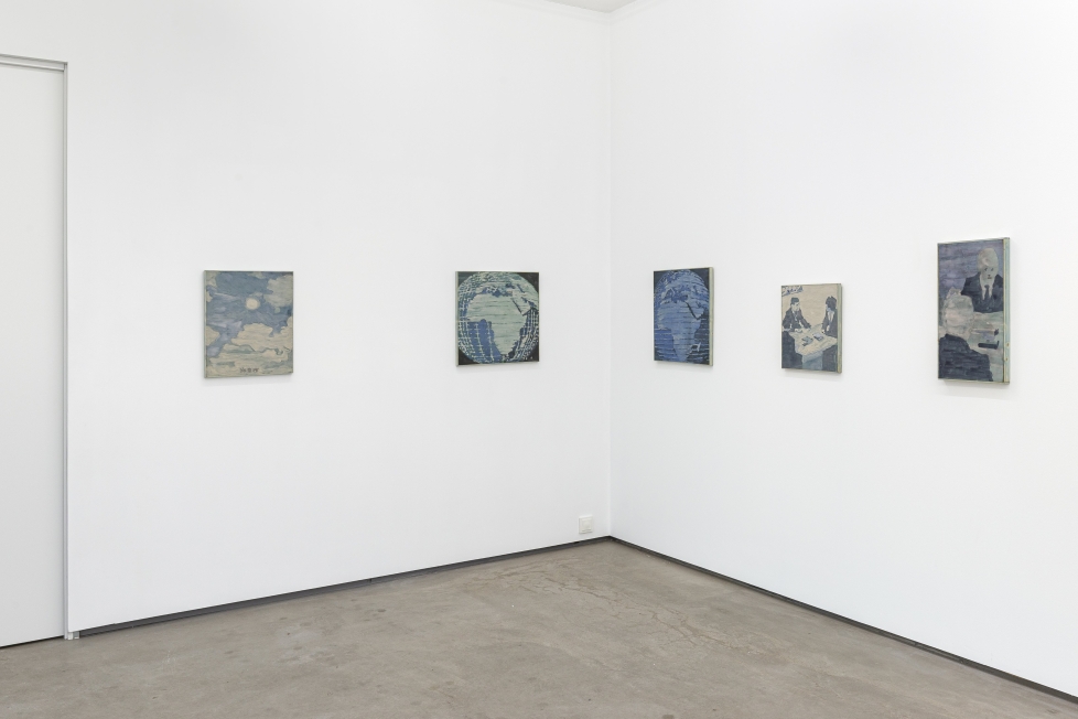 Krogh-Hansens malerier fortoner seg litt som kart eller tekniske plansjer i blålige toner, attpåtil heter to av dem Verdensbilde (alle verk 2025 ), og forestiller globus-lignende former i trange billedrom. Andre titler dyrker også en slags deskriptiv nysaklighet: i Møte har deltagerne i dress store hoder og kjapt skisserte, enfoldige trekk; i Arbeidsgruppe 1 og 2 står en lignende gjeng oppstilt på rekke, i det siste nesten helt rastrerte; i Lett skydekke, av en hvit sol som titter frem fra skyer med krøllete kant, står muligens «wow» skrevet i nedre kant, som en tørrvittig kommentar til et bilde som ikke akkurat skilter med det spektakulære. Selv om disse maleriene kan kalles atmosfæriske – gjennom sin diffuse, liksom utviskede karakter – oppfattes de ikke som innsmigrende. De fastholder heller noe skjematisk, en trakt vi ser verden gjennom, og dermed ikke egentlig observerer fritt (eller klart).