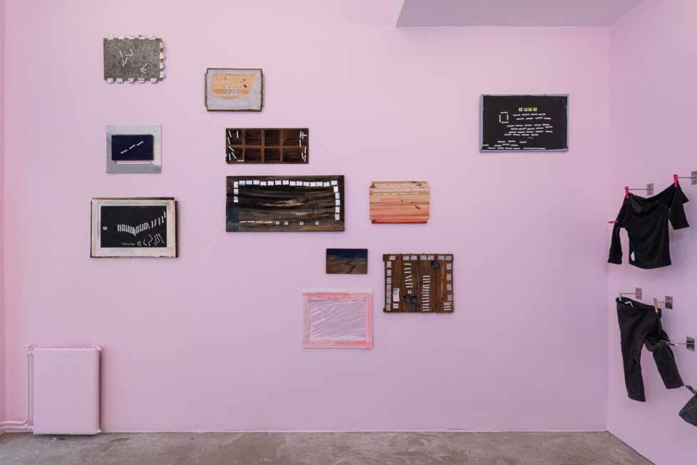 Heilmann, som gjerne pirker borti konsumkultur og livsstilsmarkører, har på en bakgrunn av forlokkende rosa, hengt opp en kavalkade av små materialbilder i ulike høyder, nødtørftig satt sammen av å tilfeldige og slitte materialer, rester fra forbruk og muligens funn fra gaten. Over to vegger løper svarte klesplagg i påfallende animerte positurer. Hellmann synes lenge å ha vært opptatt av klær som megetsigende hylstre for identitet, tidsteft og aspirasjon. Hun har blant annet tidligere stilt ut sine egne brukte luftige Laura Ashley-kjoler med all deres småblomstrende nostalgi og volanger i et slags galleri-showroom som mimer konsumkulturens presentasjoner, med mannekenger og klesstativ (på Vestjyllands Kunstpavilion i 2019).