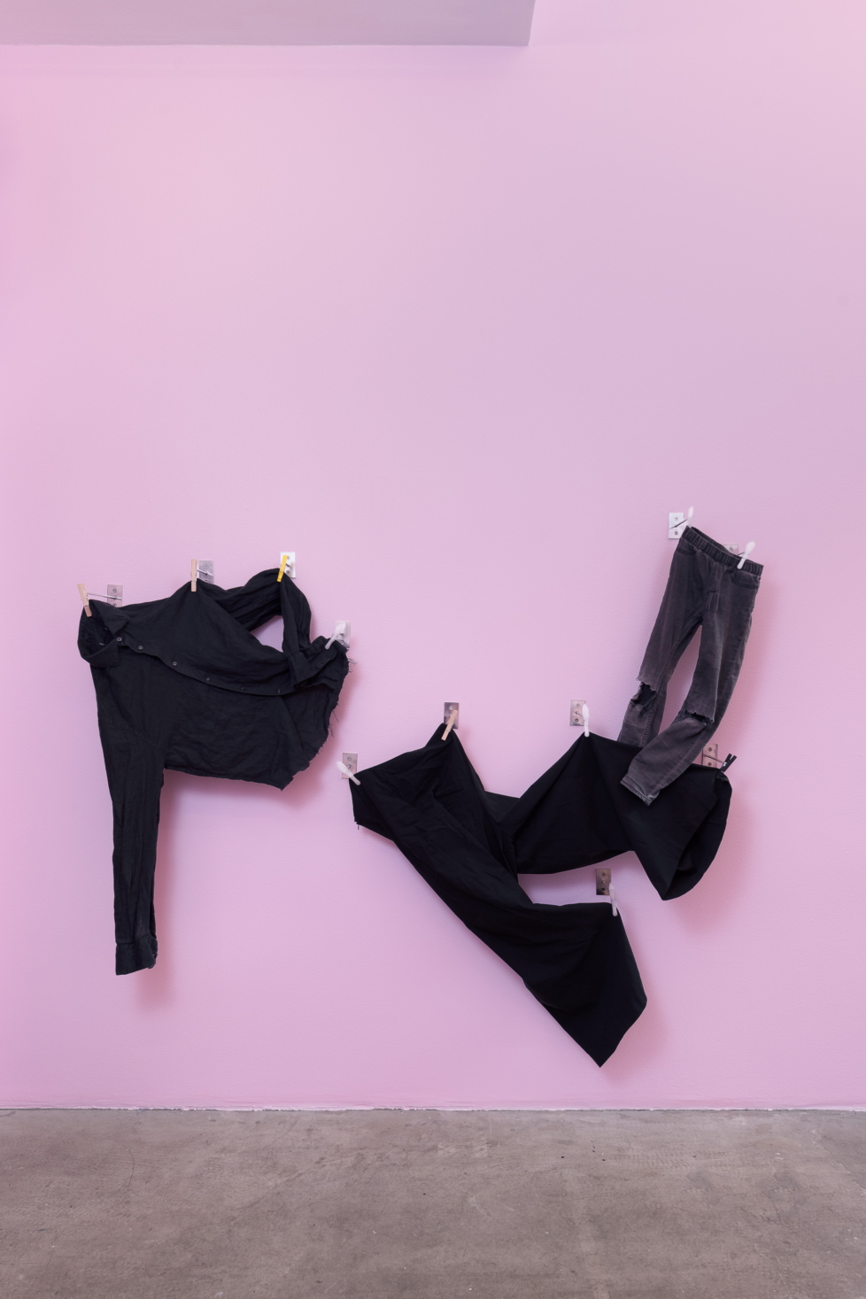På Pachinko er det tekstile innslaget umiddelbart mer monokromt og nedskrellet, til tross for dramatiseringen. Svarte overdeler (gensere på vranga, en skjorte), svarte jeans og andre bukser som tomme og avlagte, smått fillete habitter er hengt opp ved hjelp av klesklyper og metallfester. Et kneparti holdes oppe, slik at nederste del av buksebeinet faller slapt, en genser ser ut til å blåse av gårde med oppstrakte ermer. Plaggene, både i voksen- og barnestørrelse, er fikserte, men likevel med en viss dramaturgisk fremdrift, liksom dansende. Her blandes vår tids vedvarende appetitt for uanstrengt og ordnet skandinavisk minimalisme med noe mer grumsete og opptrevlet. Det synes absolutt ikke å være en stilisert og konfronterende, eksistensiell grunge à la Anne Imhof som Heilmann spiller opp til her, mer noe i retning av slitasje etter jobb, lek og gjentatt sentrifugering i vaskekjelleren. Desillusjonerende hvordan klær slites, et tegn på tidens gnukkende effekter og anstrengt økonomi.
