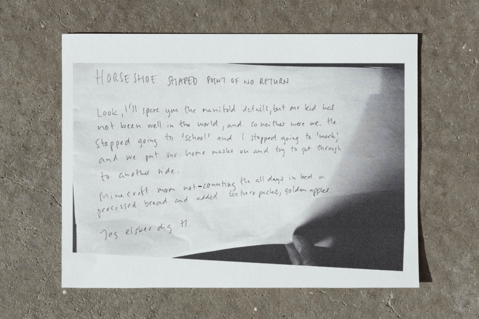 Generasjonene representert av plaggenes ulike størrelser, blir en slags tegneseriefigurer som interagerer på veggen, og de overlapper med hverandre i monteringen som ser ut til å illudere fritt fall. Det er et intimt mikrounivers vi ikke får innpass i, men en håndskrevet tekst distribuert i lokalet – og titlene på verkene – mer enn antyder en mor-barn-relasjon og oppdragelsens sosialisering av barnet, med tilhørende friksjon. Adhd er nevnt i én tittel, i andre nevnes fritidsaktiviteter og famileroller: Public pool (w. cousin), Minecraft mom. Den fritt drodlende teksten slår fast at: «our kid has not been well in the world». Omsorg og kjærlighetserklæringer hører også med, i kontekst av skolevegring og dager i senga.