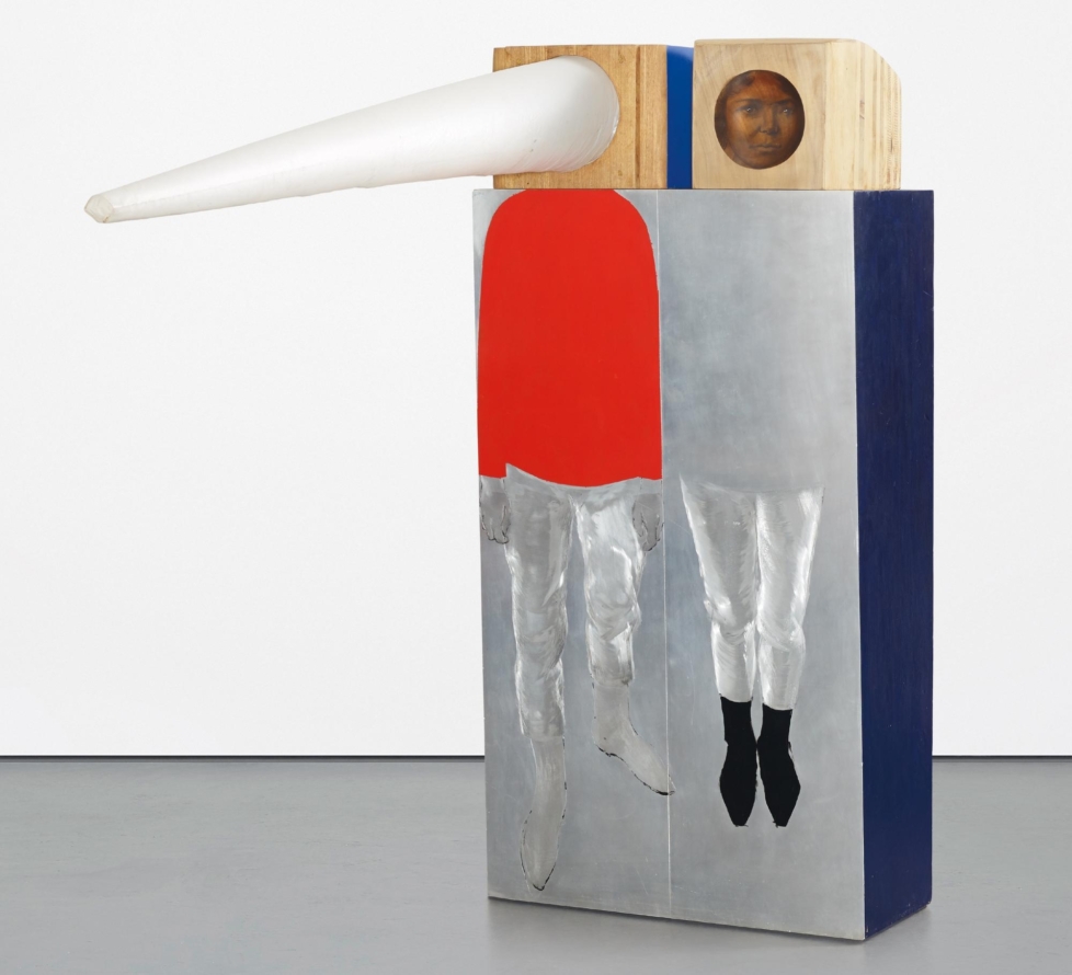 I det mere abstrakte værk Couple No. 1 (1965-66) er to træfirkanter sat sammen, de danner to mennesker henholdsvis malet i sølv og rød, mandens hoved stikker ud af træet, men er bare et stort hvidt horn, kvindens ansigt er tegnet og rammet ind i en cirkel i træet. Det er første men ikke sidste gang på udstillingen, at jeg kommer til at tænke på Bruce Nauman og hans både minimalistiske og pompøse skulpturer af dyr i bevægelse, hænder på rad og række og film med opdelte kropsdele, jeg er sikker på, at synet af denne skulptur for en kunstner som ham har været kilde til evig inspiration.