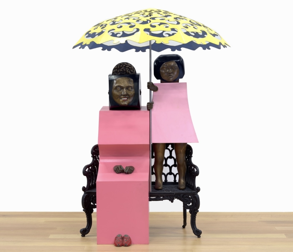 Den ene karakter er større end den anden; en mor og en datter. Barnet står op på bænken for at kunne holde paraplyen over dem begge, hendes lyserøde kjole svajer, benene stikker ud under den, hænderne holder hårdt om paraplyen, hun har en alvorlig mine i ansigtet som er udført i mørkt lakeret træ, en lille sort page, som ligner den Marisol i mange år selv havde, hun holder paraplyen som om den skal beskytte moderen mod mere end regn og mønsterskygger. Moderens hænder stikker ud fra hendes krop, som ellers blot er formet som et pink rektangel som for at give plads til alt det, vi selv skal forestille os. Hendes runde hoved er sat oven på kroppen og placeret indeni endnu en firkant, begge udført i mørkt lakeret træ som datterens, men hvor datterens ansigt er determineret og vredt, virker moderens stive smil skræmmende, fletningen i hendes hår kunne lige så vel være en blottet hjerne som en flatterende frisure. Nederst hvor moderens firkantede krop rammer gulvet står et par røde lædersko sirligt placeret.