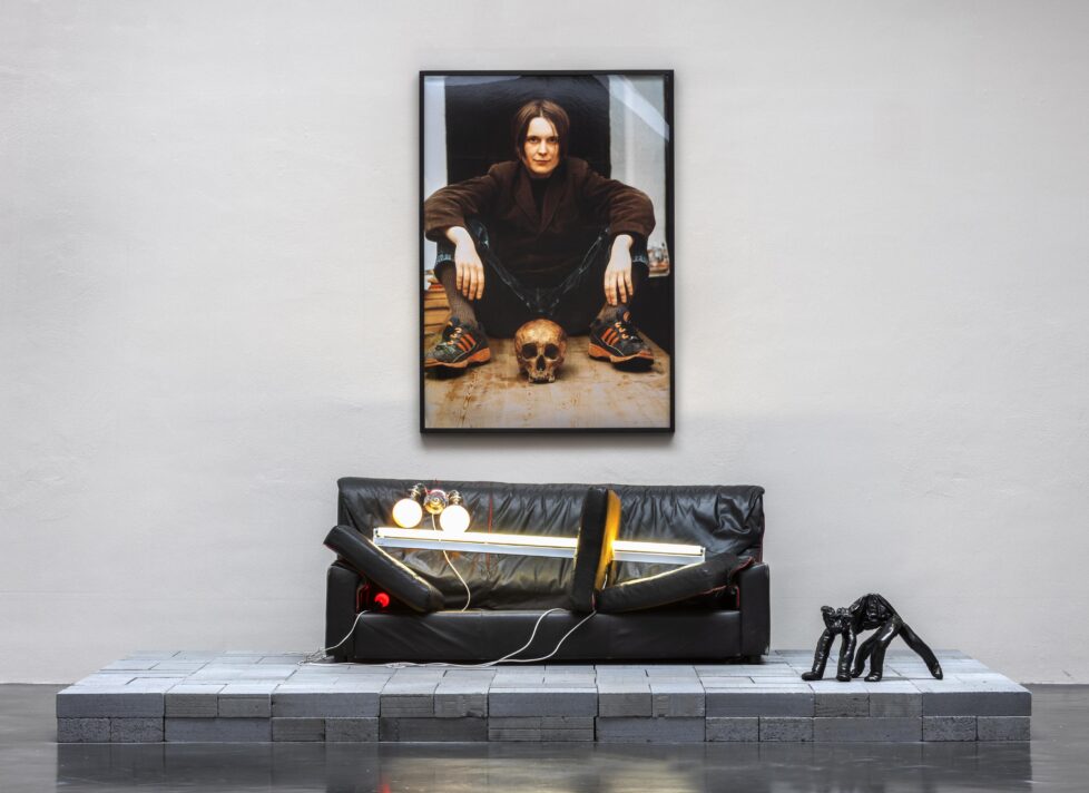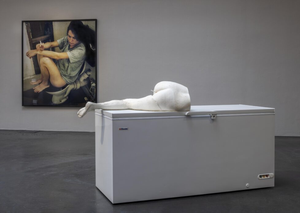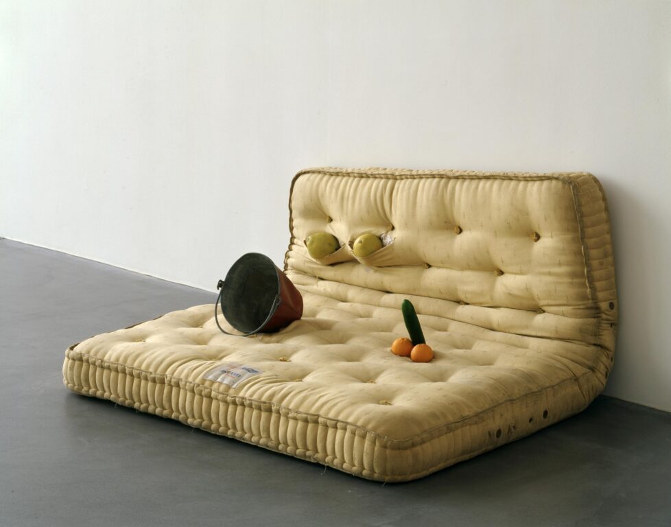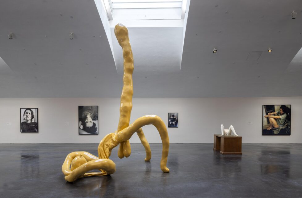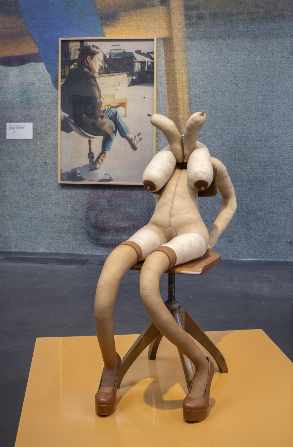 Inget av detta är ofrånkomligt. När jag tittar på dokumentationsbilder av Lucas utställning i den brittiska paviljongen vid Venedigbiennalen 2015 och av hennes separatutställning i Tate Modern 2023–24 ser jag färg och gamman. I Venedig valde hon att måla den värdiga paviljongsbyggnadens rum i en skrikig gul färg, på Tate visades hennes skulpturer på udda podium med en distinkt DIY-estetik. Fotografierna vittnar om jättestora smörgåsar, rosa pölar, sönderbrända fåtöljer, tvättmaskiner och toaletter. Det är saker som säger mig mycket mer om könsroller än klackskor och ståfräs. Jag kan inte annat än förundras över hur effektivt Lucas berövas på allt vad edgy heter då Kiasma tar sig an hennes konstnärskap. I försöket att kristallisera hennes oeuvre har man filat bort alldeles för mycket.