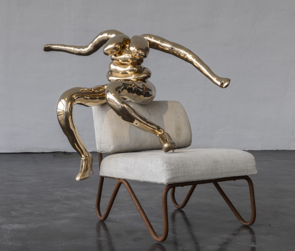 Det främsta exemplet är två kattliknande svarta bronsskulpturer. På avstånd tilltalar de mig eftersom de bryter monotonin i utställningen, som i alltför stor utsträckning fokuserar på Lucas groteska avbildningar av korviga kroppar med hängpattar. På närmare håll ser jag att «katterna» har kroppar lika skrumpnade som en girigt tömd bag-in-box-påse och att deras trinda ben glänser som om de var klädda i fetischkläder av latex. De är som något direkt ur en särdeles vidrig mardröm, men Lucas sätter stopp för affektiva analyser genom att döpa paret till Tit Tom 1 respektive 2 (2023). Syftningen på kärlekskranka hankatter (tomcats) omvandlar figurerna till något löjeväckande, till och med patetiskt. De känns på något sätt stympade, som Samson utan sitt hårsvall.