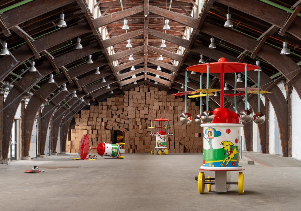 Rummets historie som godsbanegård er udgangspunktet for tre skulpturer, der alle er en voldsom forstørret udgave af et legetøjstog. To af skulpturerne er opretstående, mens den sidste ligger på siden, som var der sket en afsporring, eller havde en kæmpe fod ved et uheld sparket legetøjet omkuld. Forlægget er efter signende et japansk træk-op-lokomotiv fra 1960’erne med bjælder hængende fra taget og fine, håndtegnede motiver på siden